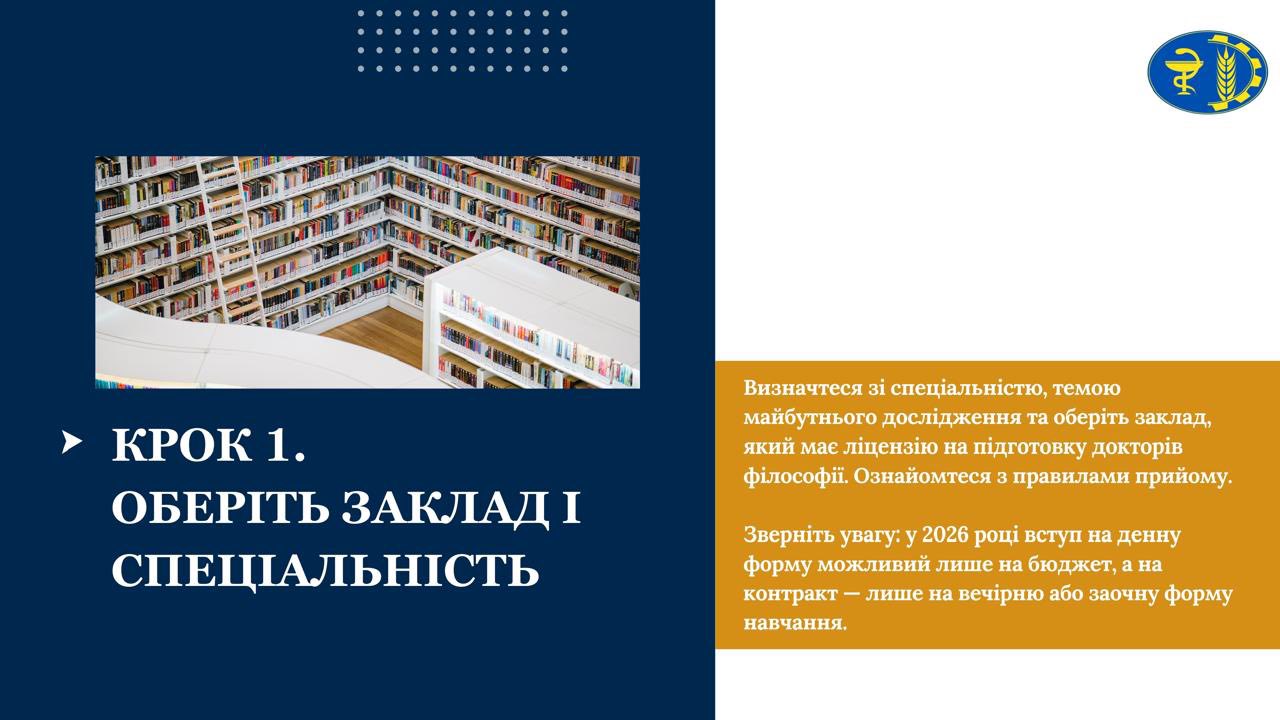 Визначтеся зі спеціальністю, темою майбутнього дослідження та оберіть заклад, який має ліцензію на підготовку докторів філософії. Ознайомтеся з правилами прийому. Зверніть увагу: у 2026 році вступ на денну форму можливий лише на бюджет, а на контракт — лише на вечірню або заочну форму навчання.